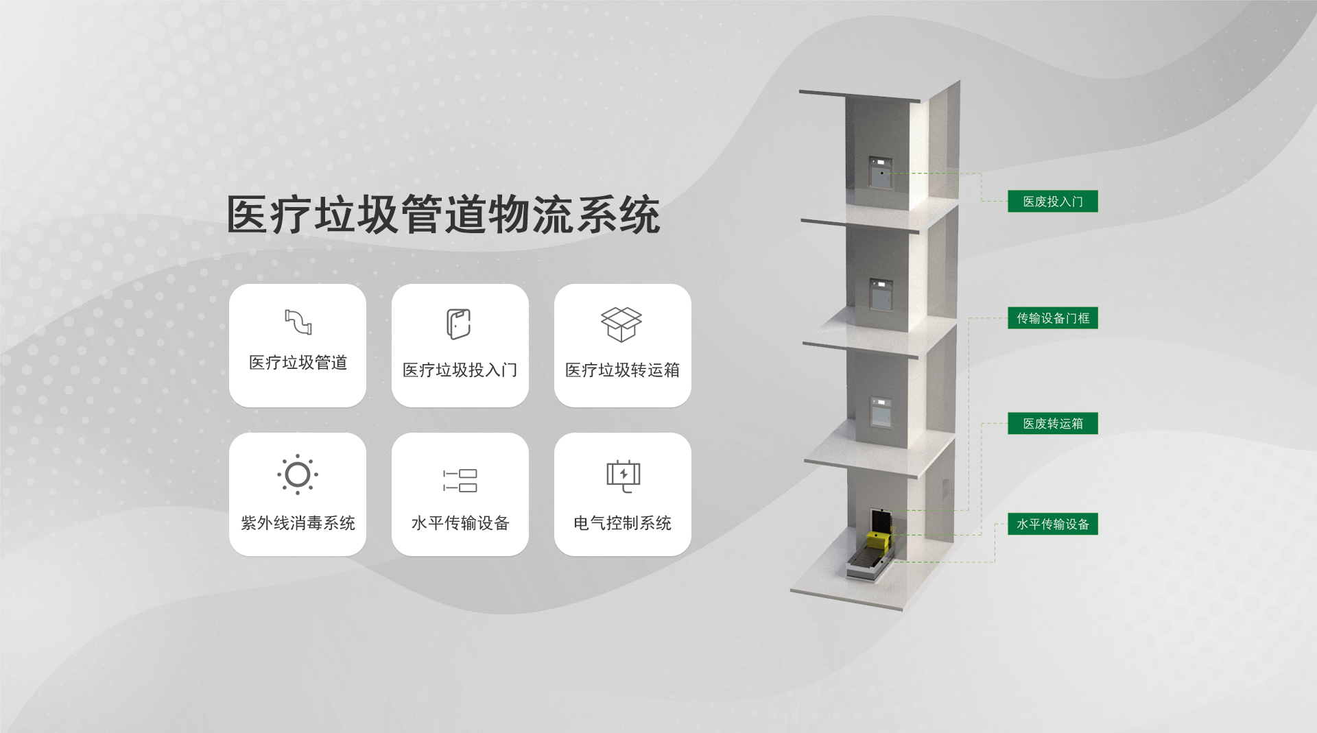 系統(tǒng)簡(jiǎn)介:通過(guò)氣力式輸送管道對(duì)醫(yī)院內(nèi)的垃圾和污衣被服進(jìn)行收集,是一種對(duì)垃圾實(shí)行全封閉、壓縮化、集裝化收運(yùn)的現(xiàn)代垃圾運(yùn)輸及匯集方式...